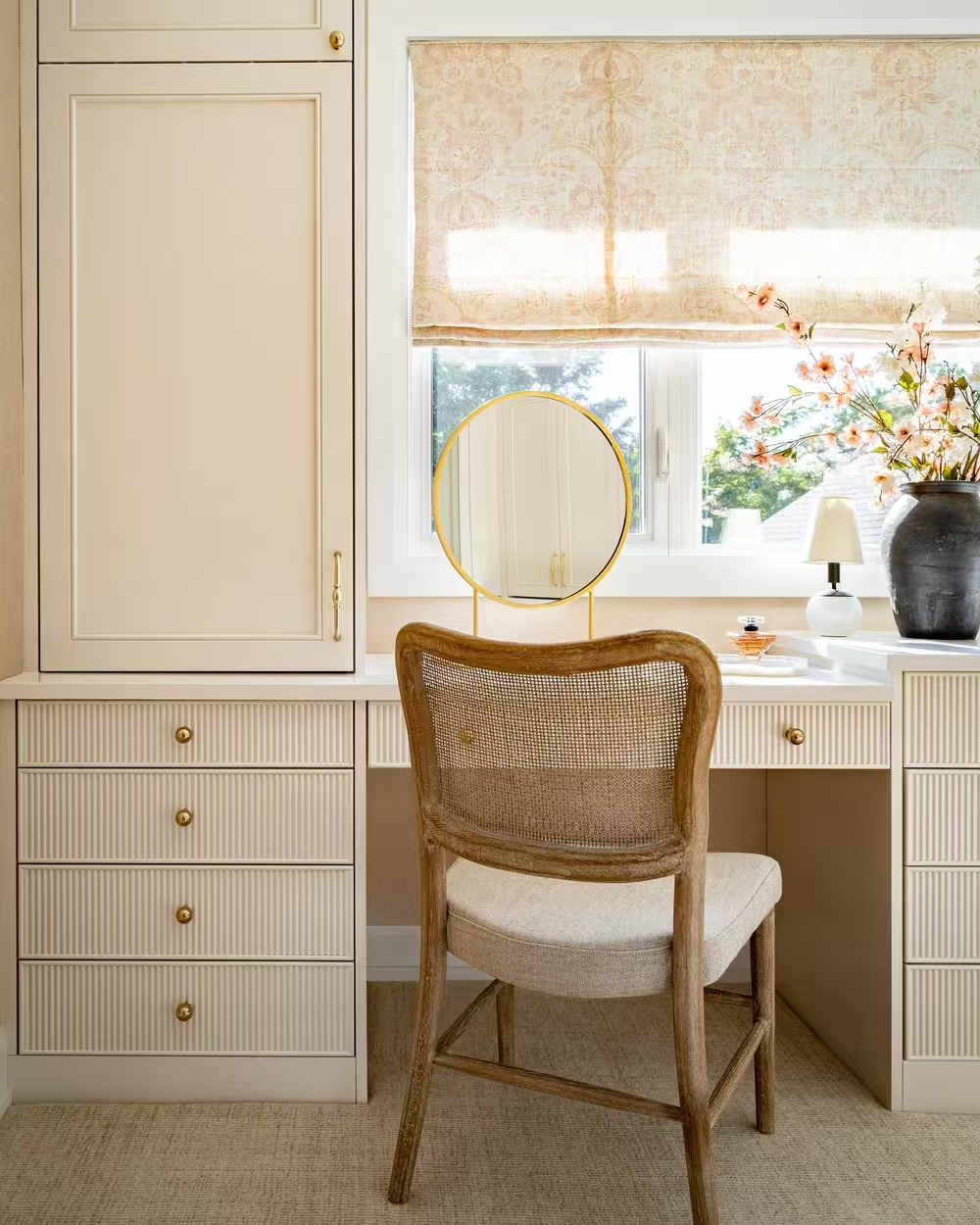柔和的奶油色调、温暖的黄铜五金件以及标志性的凹槽柜体细节——这款衣柜完美诠释了低调的奢华。